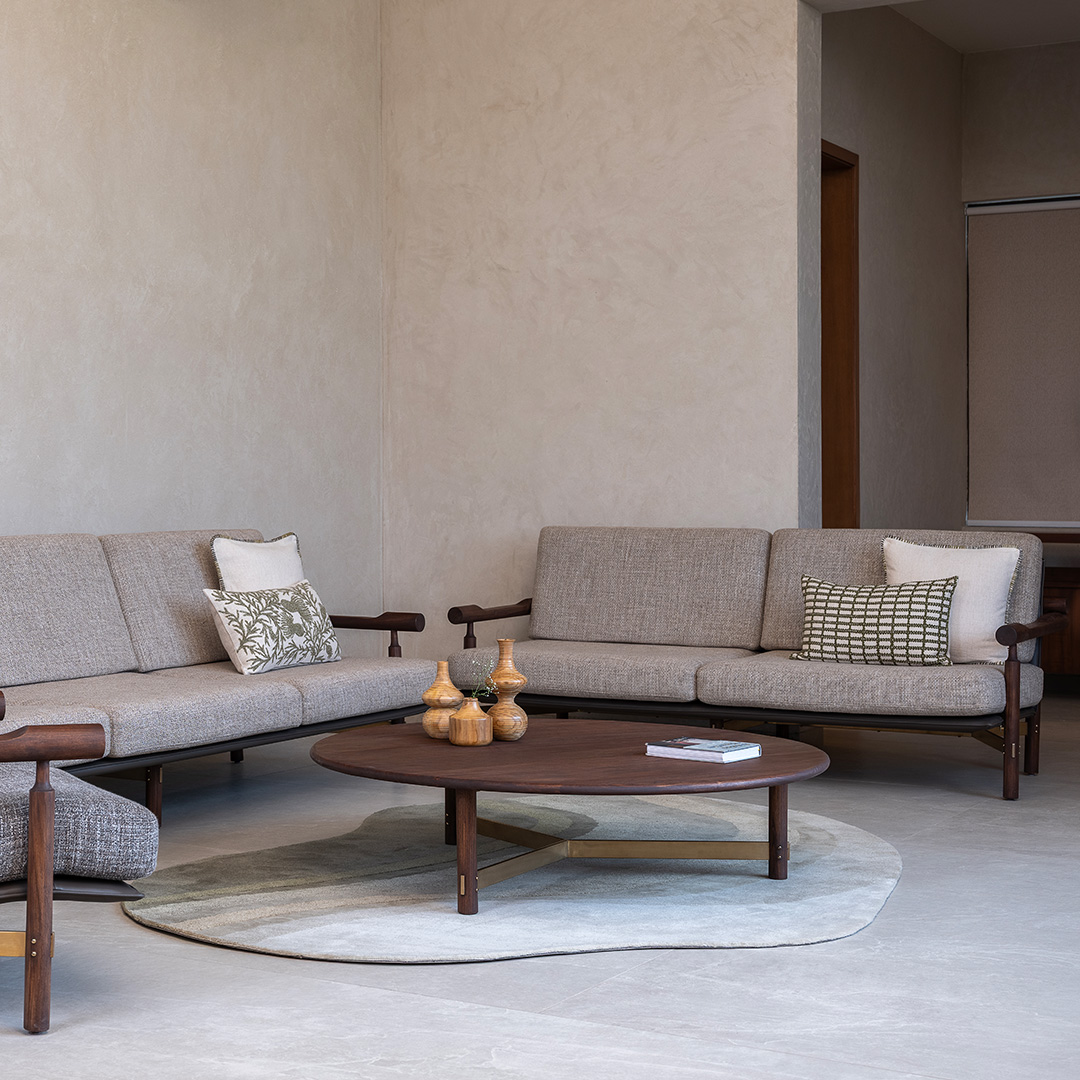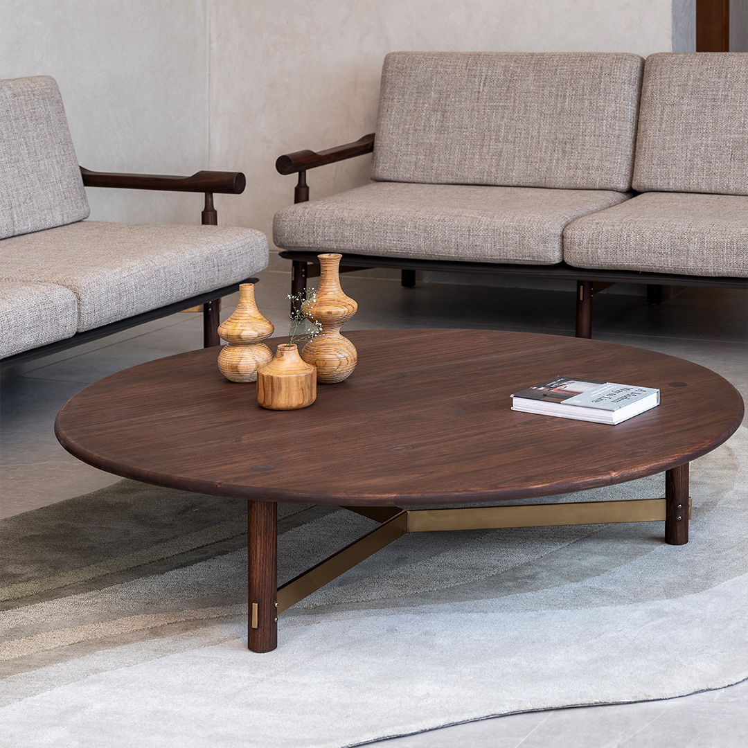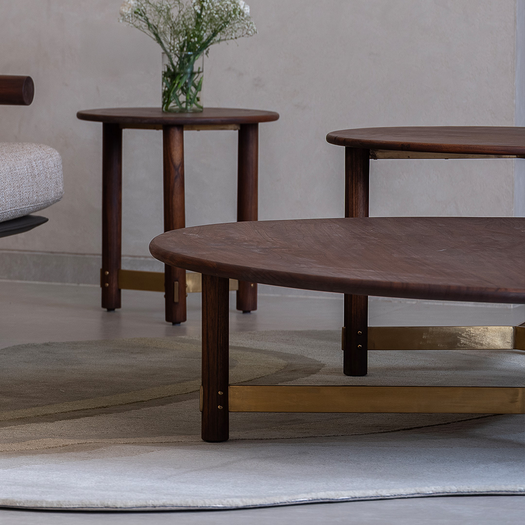 The Arq Coffee Table combines a broad wooden surface with sleek brass-finished detailing, creating a balanced centrepiece for living spaces. Its circular form softens the setting while offering ample space for everyday use or decorative accents. Both practical and refined, it anchors the room with ease.