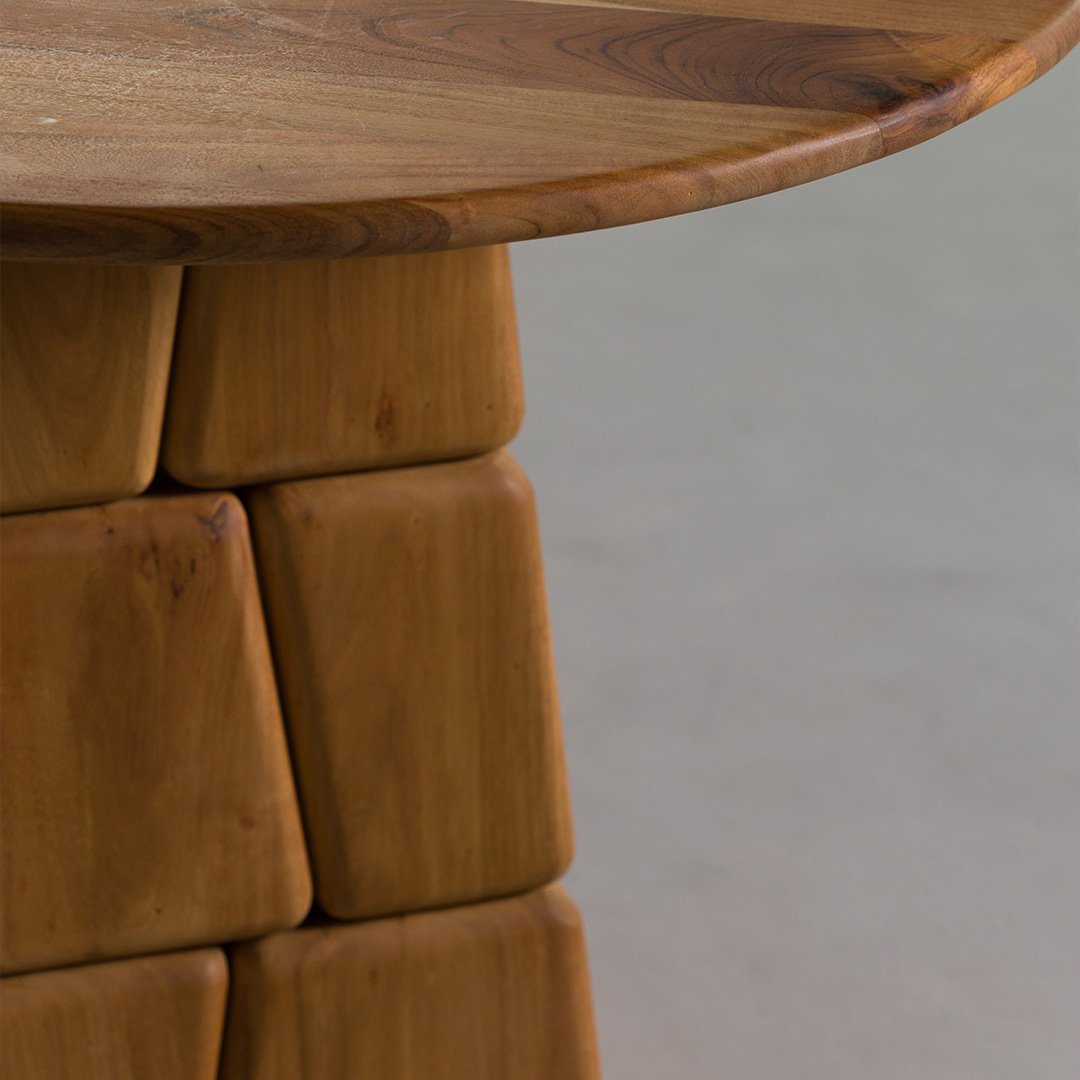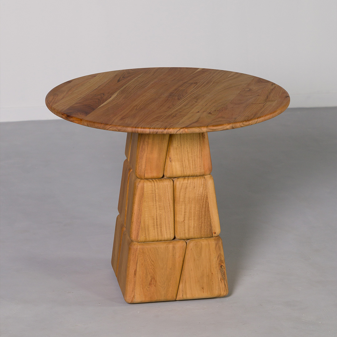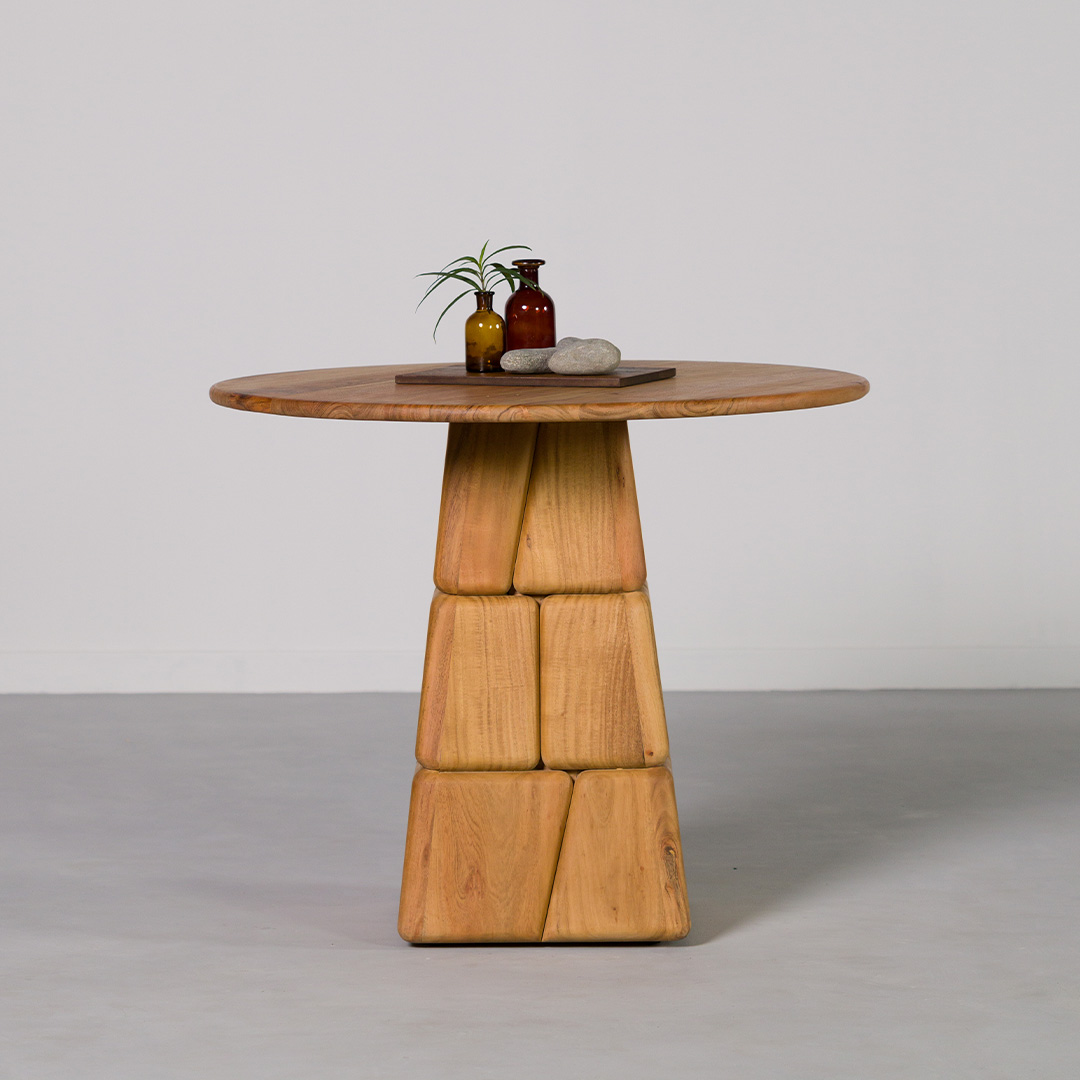 A uniquely crafted acacia wood table with a layered, stacked base, exuding a bold yet natural aesthetic. Its 90 x 90 x 77-cm frame provides a sturdy surface, making it suitable for dining or as a statement workspace. A perfect blend of function and artistic expression.