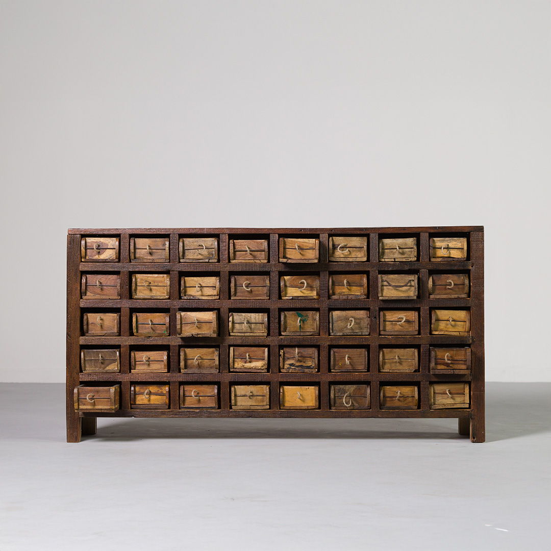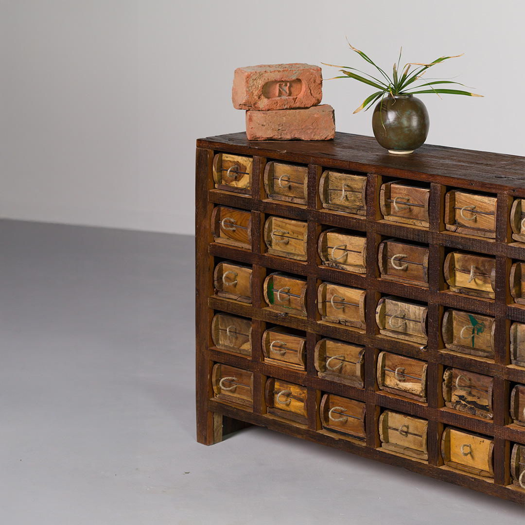 Made from repurposed brick moulds and wood, this multi-drawer cabinet offers a striking balance between rustic charm and modern utility. Ideal as a console, sideboard, or decorative storage piece, its multiple drawers provide ample organisation while adding a textured, vintage aesthetic to any room.