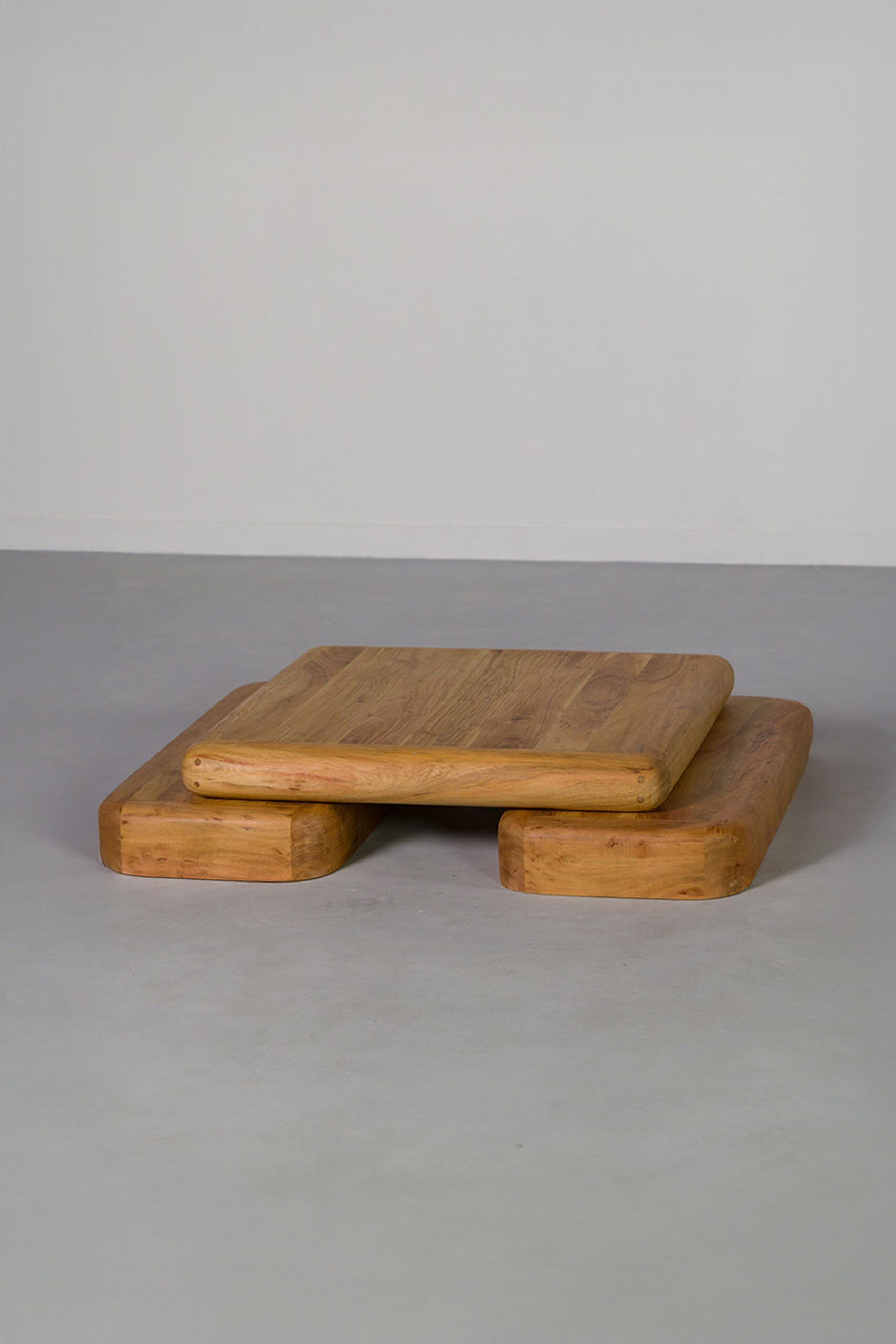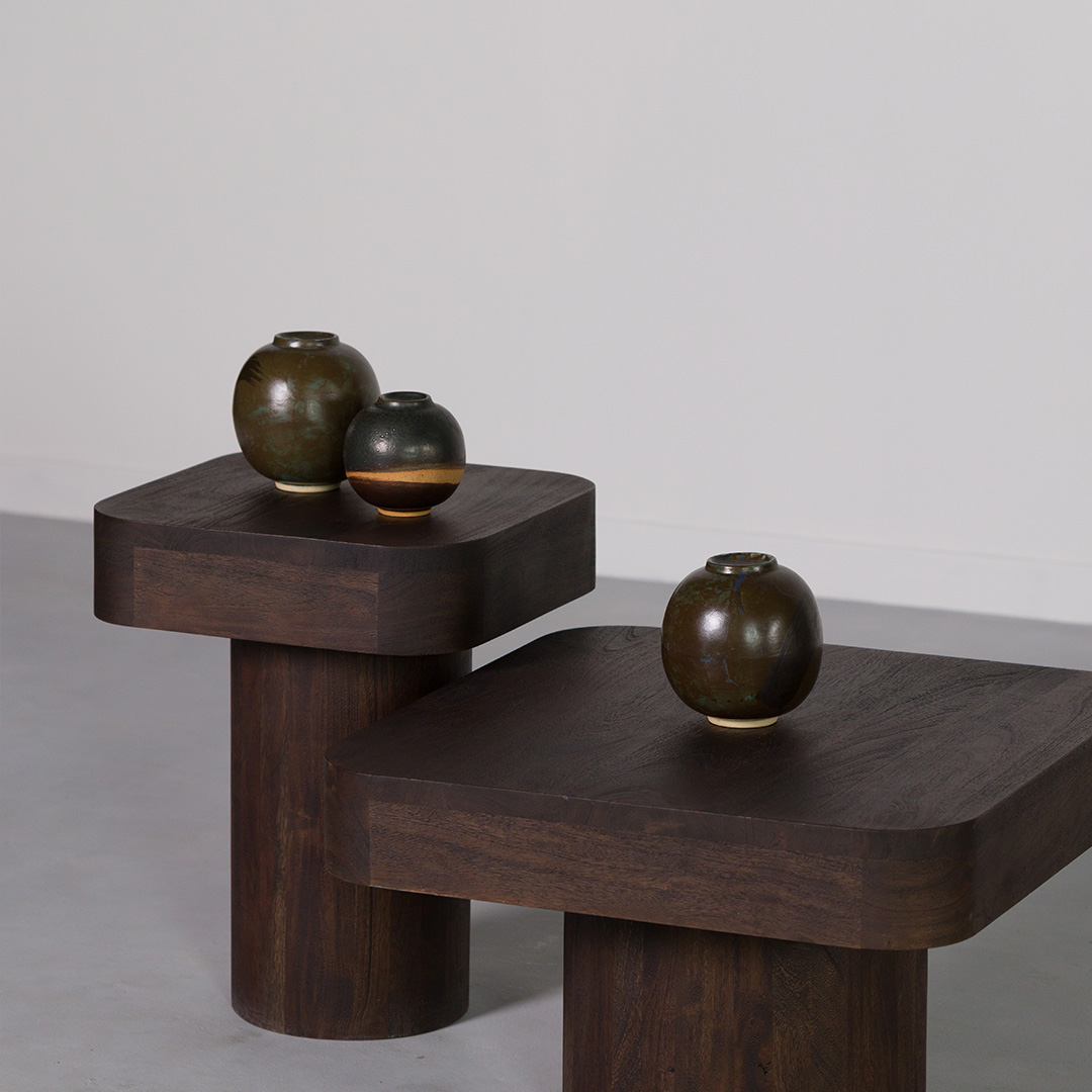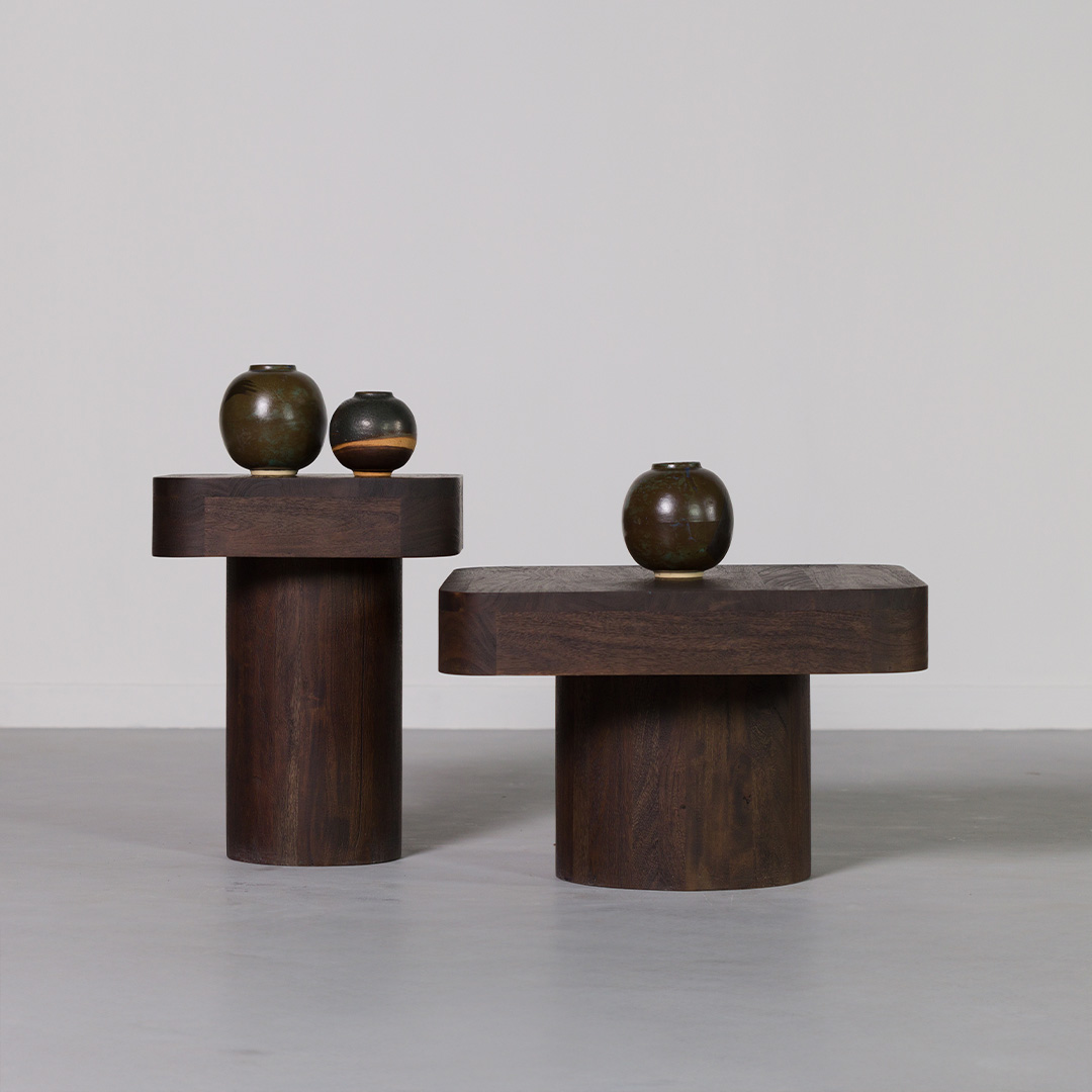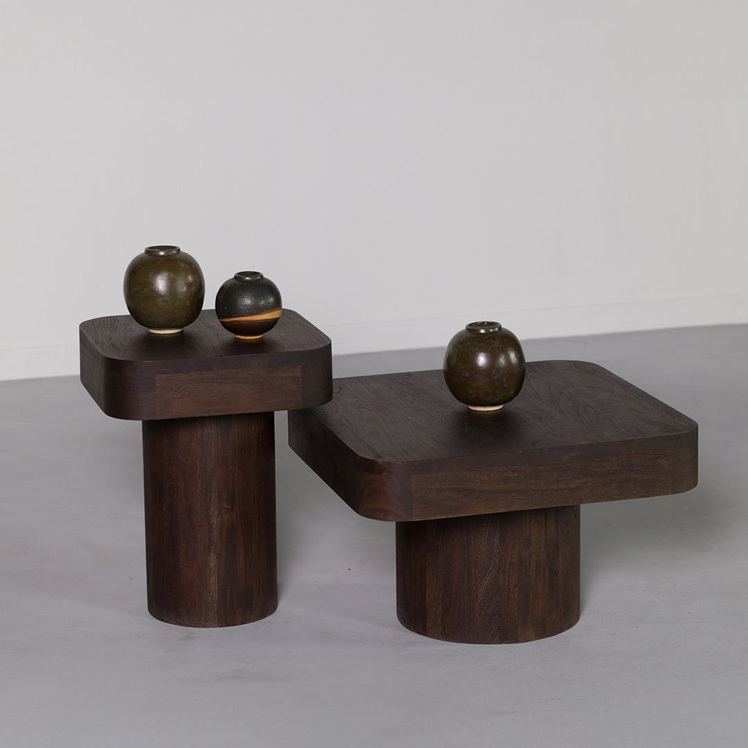 A perfect blend of form and function, the Twain Table Set features two nesting tables designed to bring versatility and texture to any space. Crafted from solid wood with a brushed finish, the surface enhances the natural grain, adding depth and organic appeal. The square tabletops rest on cylindrical bases, creating a sculptural silhouette that works beautifully as a statement piece or functional side tables. Whether styled together or separately, this set effortlessly complements both modern and rustic interiors.
