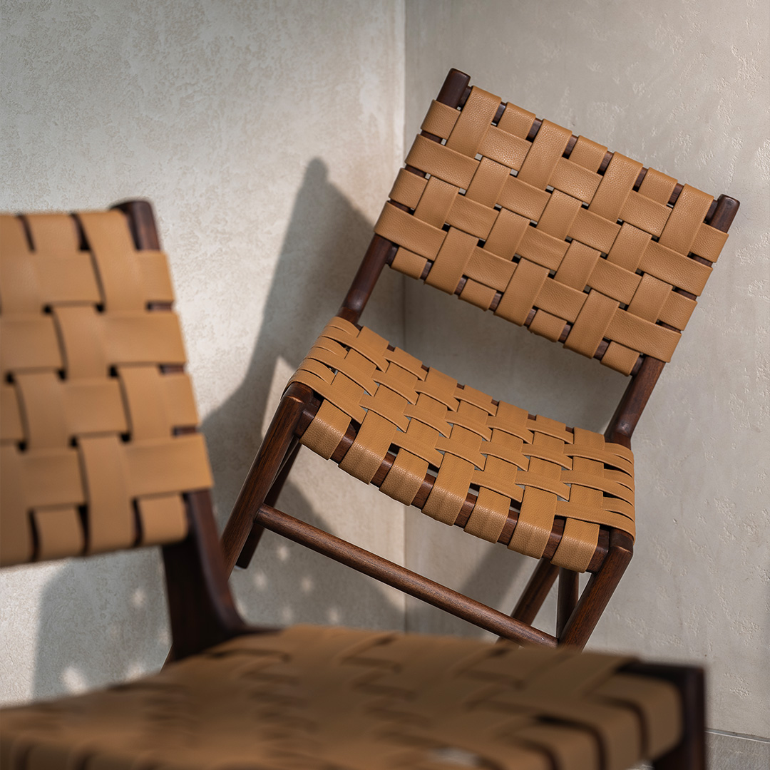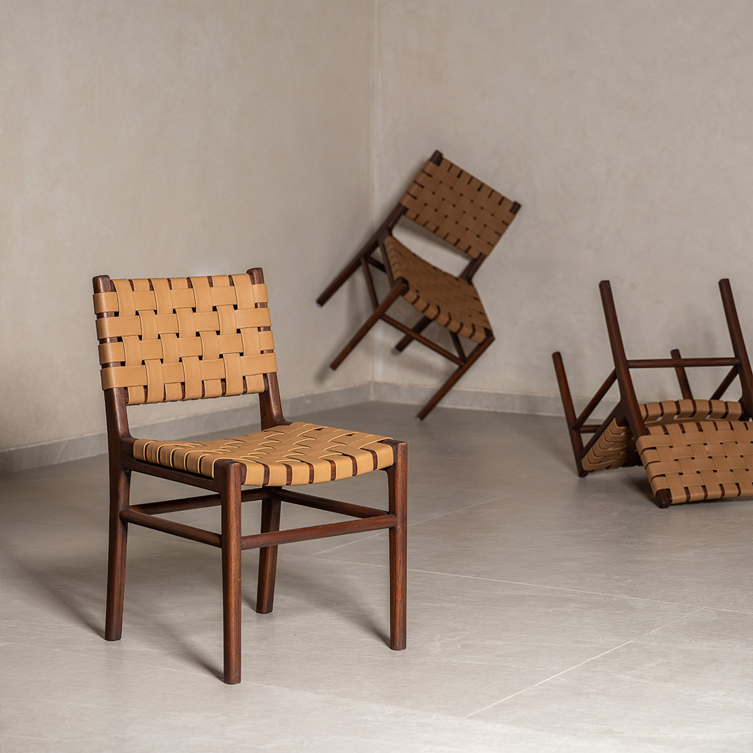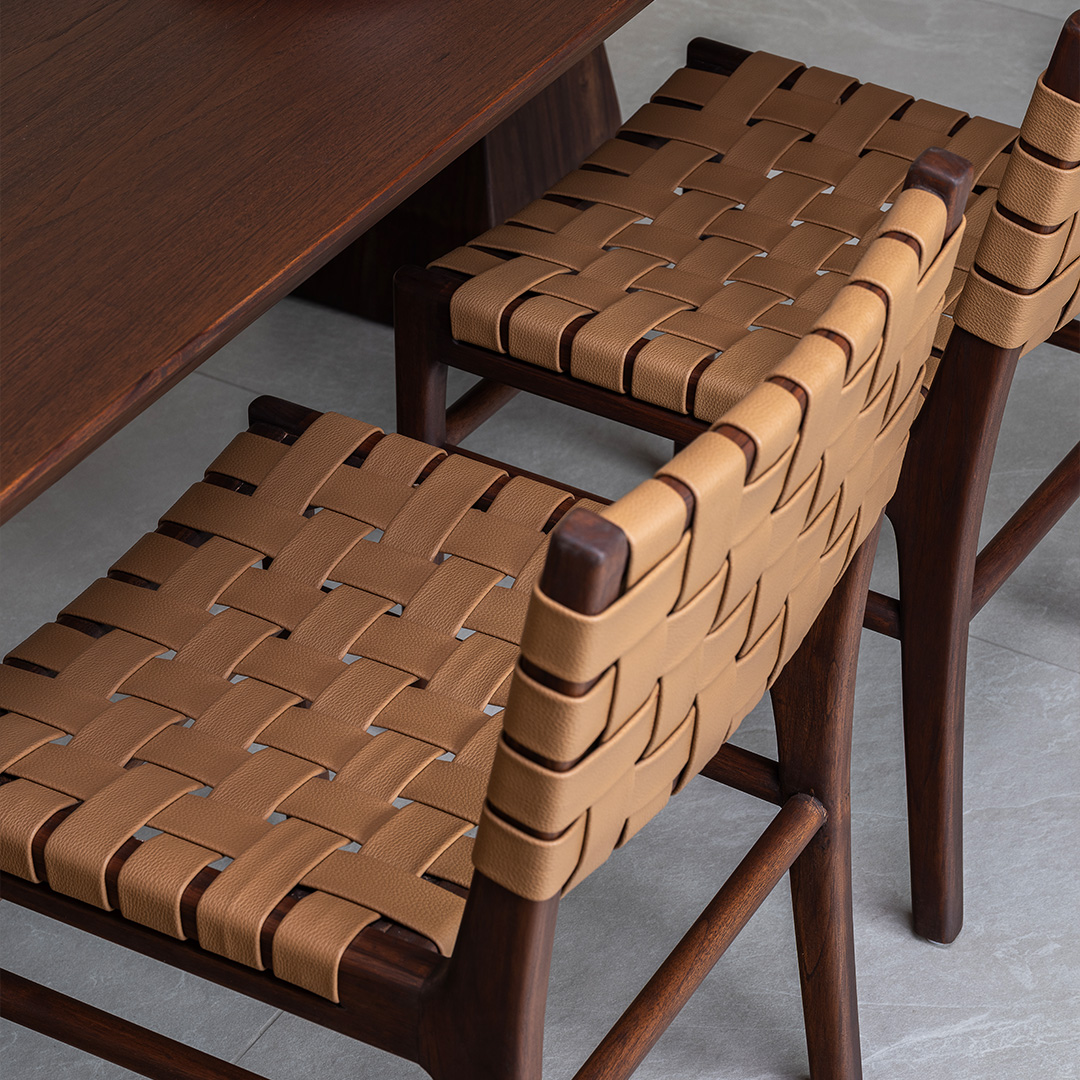 The Vana Dining Chair blends a solid wooden frame with a handwoven vegan leather seat, offering both durability and tactile comfort. Its creative form complements the Vana Dining Table while standing strong on its own. Designed for everyday use, it brings warmth and texture to dining spaces.