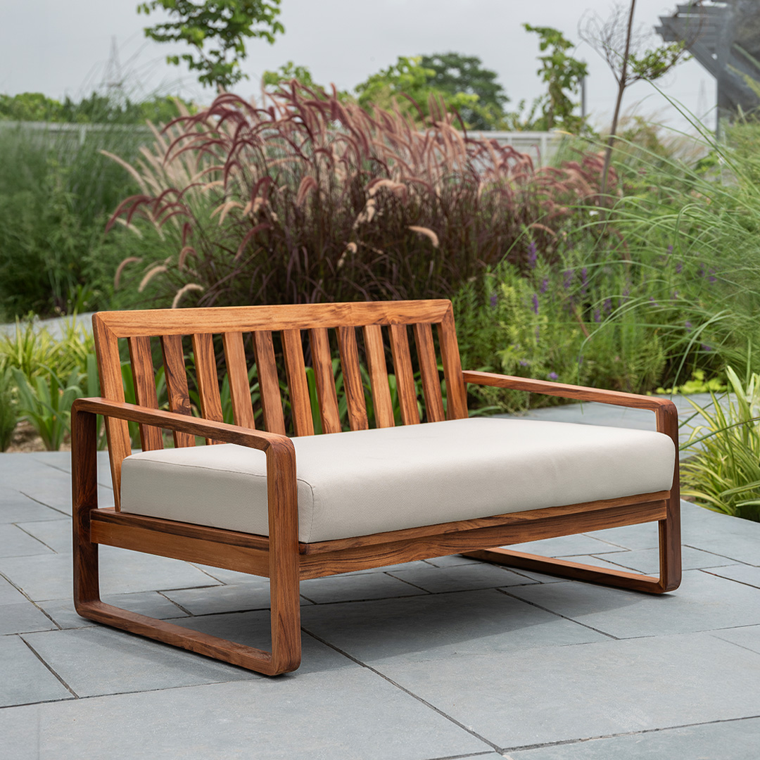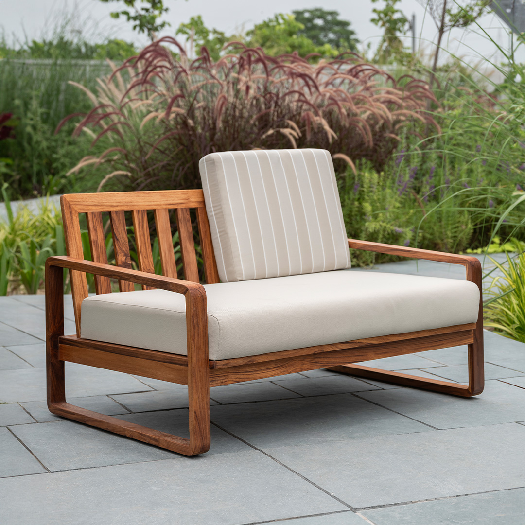 The Varma Outdoor Sofa combines the strength of solid teak wood with the ease of weather-ready fabric. Designed with a low, open profile, it brings a sense of relaxation to outdoor settings while offering ample seating. Its natural tones blend seamlessly with garden or terrace landscapes, making it a durable and inviting choice for open-air living.